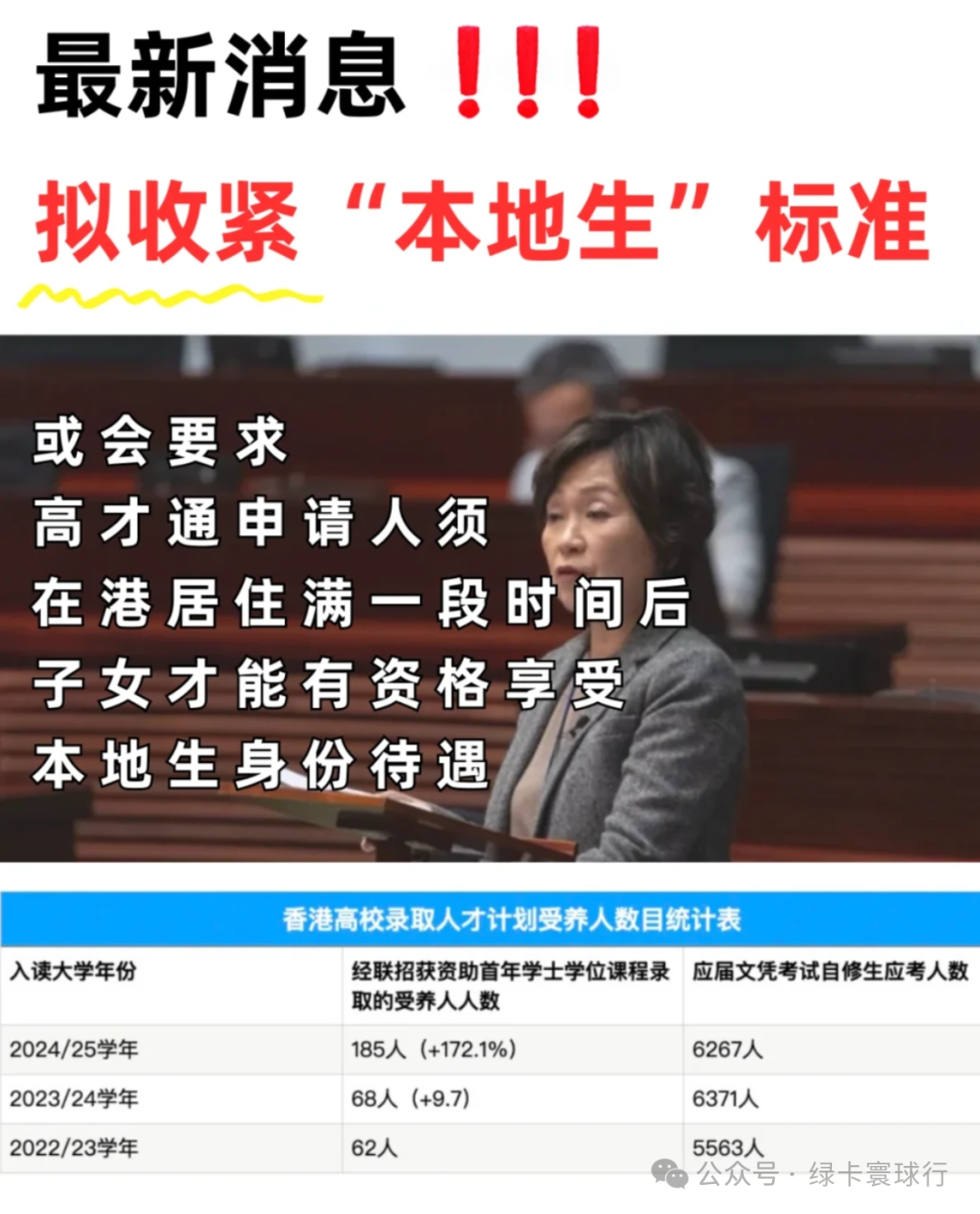 ✅“本地生”的门槛,真的变了! 先说说现在的政策。 这意味着,即使家庭实际常住在内地,孩子只要“入境时间点”卡得好,也能直接享受本地学费、本地学额,甚至是联招录取优先权。 本地生 VS 非本地生,升学差距有多大? 不少家长抓住这个“红利窗口”,通过高才通、优才、专才等计划拿香港身份,再“闪送”子女返内地,等考大学时再回来参赛。 4月26日,蔡若莲在接受媒体采访时明确表示: “我们正研究相关签证安排,将来可能会要求高才通申请人须在港居住满一段时间后,其子女才可享有本地生身份待遇。” 这已经不是第一次提到这个方向。早在今年2月,她就曾说过: “子女如果有香港身份证,没有理由不是本地生。” 但现在语气变了—— 消息一出,立即引发家长圈热议。 香港移民市场从未冷清。关键在于通道是否有效、投资是否灵活、身份是否保值。 而本轮资本投资者入境计划,恰恰抓住了这三点: 批签快:原则审批阶段速度远高于高才通,现有341宗已获正式批准。 门槛实质性放低:申请人只需证明6个月内拥有3000万净资产即可,不查收入、不查学历、不查雇主。 持有他国永居可申请:规避“单一国籍”限制,成为中国内地高净值群体快速绕道的关键通道。 官方数据已经显示,仅短短1个月内(2025年3月1日至月底),新增174宗申请,绝大多数为中国内地人士。 不少申请者选择的永居身份来自几内亚比绍、瓦努阿图等地。这些国家的特点是:批复快、费用低、手续简便。作为申请香港投资移民的“身份跳板”,再合适不过。 为什么香港突然对“考试移民”下手了? 教育资源吃紧是直接原因。今年,香港文凭试(DSE)报名人数激增了2000多人。 如何精准投放教育资源? ✅ 英国模式: 想享受“本国学费”,必须在入学前三年持续居住英国。 即便是英籍,也不能“空降上车”。 ✅ 新加坡模式: 国际生申请补助后,必须毕业后在本地工作三年。 否则要补交原本免除的学费。 这两套系统的共通点是:绑定“实际居住”或“未来贡献”条件,确保资源流向真正愿意留下来的人。 从蔡若莲的讲话可以看出,香港接下来也可能会走这个方向。 趋势已定,家长该怎么应对?你需要关注以下三件事: 孩子是否是“受养人”、是否持香港身份证,仍可能是基础条件。 有业内人士预测:未来或要求“入学前在港常住满1年~3年”。 特别是通过“高才通”“专才计划”等方式拿到身份的家庭。 插班、入读本地学校、参与DSE课程,这些都能作为“居港记录”的间接佐证。 教育局已经明确: “将来会考虑为不被资助的本地学生,额外增加一些学额。” 也就是说,即便孩子不满足“资助条件”,依然可能有弹性学位,只是需承担非资助学费。 专家观点:政策打击的是 “套利型家长”, 非真心育儿者 很多家长问: 教育政策专家张欣宇议员在立法会中指出: “应防范部分人利用政策套利,但也要避免误伤真正有意留港的家庭。” 香港这次并非一刀切,而是通过门槛微调,挤出“刷身份、不生活”的投机者,释放更多机会给长期在港的家庭。 因此,如果你是真心想让孩子在港受教育,现在仍是可行的窗口。 关键是别等到孩子“临考前”才落地。越早实地生活、越早融入本地教育系统,未来变数越小。 ✅ 尽快安排实际居港:如果已拿身份,不要拖延孩子赴港时间; ✅ 提前插班、本地就读:小学、初中阶段完成港校学业,最稳妥; ✅ 关注官方消息:政策可能在今年新学年联招前正式落地; ✅ 咨询教育专家:孩子是否符合未来资助条件,需专业评估。